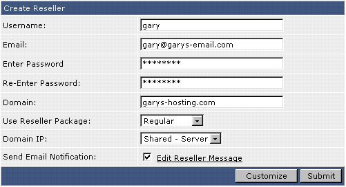 Select a pre-created package for the Reseller. See the help section on Reseller packages for more information. If you want to customize package features for this Reseller only, click the "Customize" button at the bottom of the table, after you are finished filling out the information in this table.
