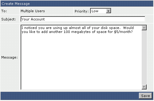 The "To:" field will say "Multiple Users" even if you only check one username in the table. Set the message priority, type in the subject and message body, then click "Save."